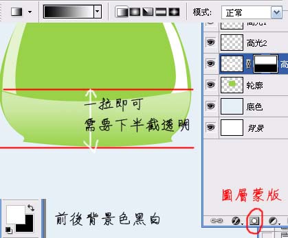 #p# 6、下面高光3的部分下半截减淡到全透明,给高光3图层添加图层蒙版,将前后背景色还原成黑白,使用渐变工具一拉即可。