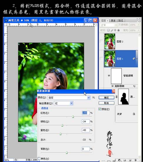 #p# 2、选择菜单:图像 > 模式 > RGB颜色,选择合拼。创建通道混合器调整图层,选择红色调整,参数设置如下图,确定后把图层混合模式改为“柔光”,用黑色画笔把人物擦出来。