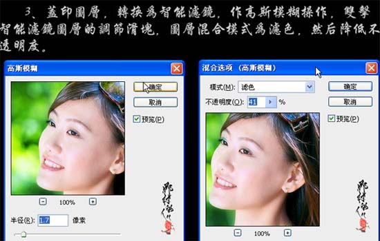 3、新建一个图层,按Ctrl + Alt + Shift + E盖印图层,转换为智能滤镜,执行:滤镜 > 模糊 > 高斯模糊,数值为1.7,双击智能滤镜图层的调节滑块,图层混合模式改为“滤色”,图层不透明度改为:41%。
