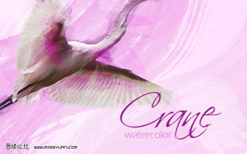 平面设计 > photoshop教程 > 入门实例 > photoshop 利用素材制作漂亮的紫色水彩画 2009-06-06 01:44:33 脚本之家 6、选择飞鹤图层,滤镜-滤镜库-艺术效果-干画笔,参数设置如下图所示: 7、作为最后的水彩细节,用另一个S形状的水彩画笔,在背景上画一些浅粉色的图案,如下图所示: 8、添加一些文字,我用的是Scriptina和ErasLight字体: 上一页 1 2 3 4 56 下一页 阅读全文