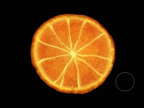 新建一层,取名“色彩”,我们用它来修饰橙子的色彩。同样给它套上蒙版。使用一个较大的软笔刷,不透明度设为20%左右,采用较明亮的黄色来在橙子中心部位和外边缘涂抹,这种方法能创造一个微妙的立体感出来,使整个橙子更真实一些。现在看上去是不是很可口了。