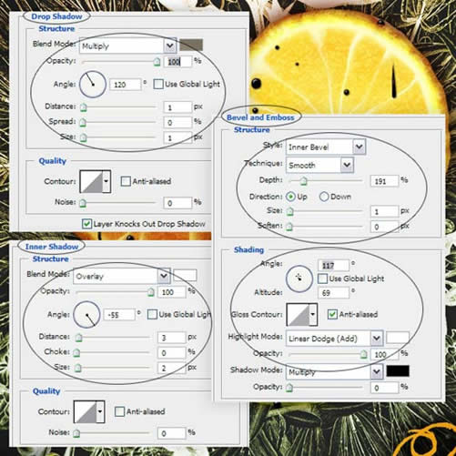我创建了一个新文档,画布大小设为了1200 px × 1200 px,并给背景做了一个由深灰色到黑色的径向渐变。把橙子们都放到新文档里,调整一下大小。然后我给每个橙子都加了一个外发光(图层混合模式里),扩展设置都为0,大小可更根据实际需要来设置,这里我设在了20-40之间。