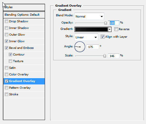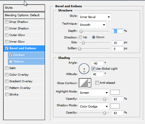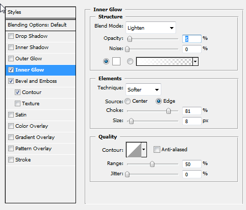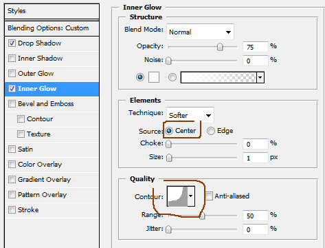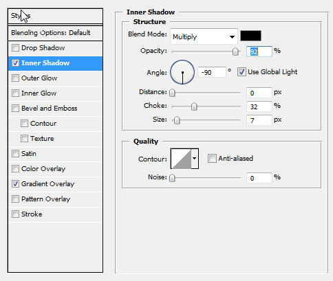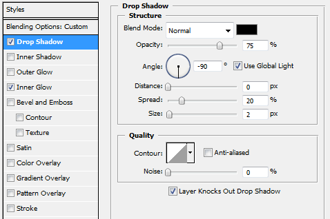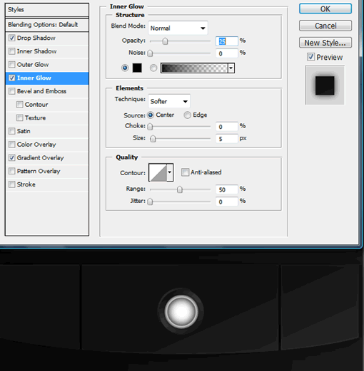 继续使用层样式设定,添加一个轻微向下的阴影,距离0 ,浑浊为90 % ,大小25px 。同时,给它一个扭转黑色内发光。这将给它一个薄反射光边缘。
