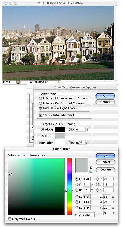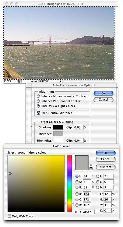 现在我们开始使用”自动颜色“来调节图像。“自动颜色校正选项”这个面板可以让我们调整几个不同的参数,但是我通常只调节其中的3个:高光剪贴(re4get: 高光剪切更恰当些 ),阴影剪切(re4get: 阴影剪切更恰当些 )和中间调颜色,注意这个顺序。默认的剪贴(re4get: 哎,真的很别扭)数值是0.50%,这是为了照顾过去的成像设备比现在的要差的多原因,过去的成像设备所得到的图中有比现在多的多的无用信息。现在,对于大多数的图像,这个数值已经是很高的了(re4get: 在cs3版本中默认是0.1%),这样会导致高光和阴影区域信息的丢失。中间调颜色默认被设为RGB 128 灰,这个设置会在许多的时候,使得结果偏冷色。所以,大多情况下,我会稍微的将R值略微的调高一点点(re4get: 一点点的意思是什么呢?就是2个半点点也许^_^)并且把B值降低相等的数值。