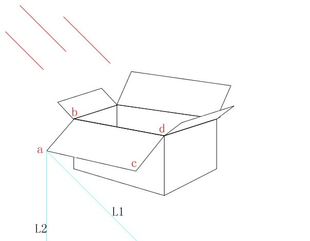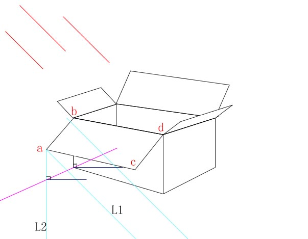 5.从A点引出L1,L2两条线,一条和光源平行,一条为法线