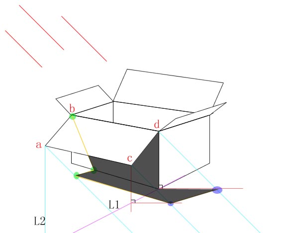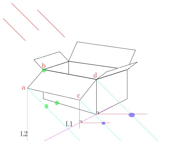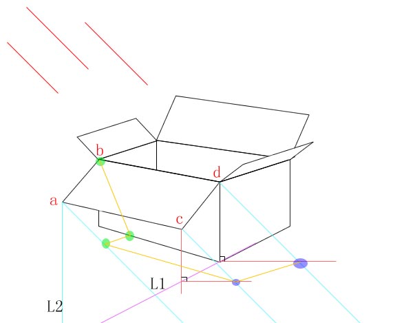 7.继续连接各点,得到图中绿色的三个点,对照上面的效果图,这三个点就是上面两边在箱子上的投影