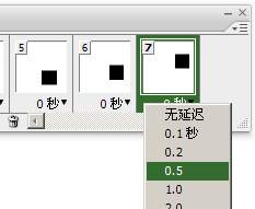 设定帧延迟的方法就是点击帧下方的时间处,在弹出的列表中选择相应的时间即可。如下左图所示,将第7帧设为0.5秒。列表中的“无延迟”就是0秒,如果没有想要设定的时间,可以选择“其他”后自行输入数值(单位为秒)。也可以在选择多个帧后统一修改延迟,选择多个帧的方法和选择多个图层相同,先在动画调板中点击第1帧将其选择,然后按住SHIFT键点击第6帧,就选择了第1至第6帧。然后在其中任意一帧的时间区进行设定即可,如下右图所示,设为0.1秒。这是一个比较常用的延迟时间。