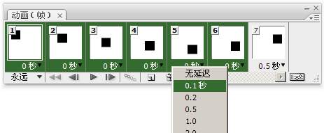现在大家可以按下动画调板中的播放按钮,在图像窗口就可以看到方块移动的效果了,只是移动的速度很快。这是因为没有设置帧延迟时间。注意动画调板中每一帧的下方现在都有一个“ 0秒”,这就是帧延迟时间(或称停留时间)。帧延迟时间表示在动画过程中该帧显示的时长。比如某帧的延迟设为2秒,那么当播放到这个帧的时候会停留2秒钟后才继续播放下一帧。延迟默认为0秒,每个帧都可以独立设定延迟。