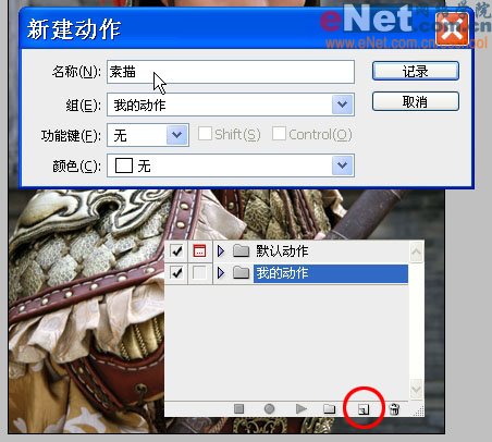 3、单击红圈内按钮新建一个动作,命名为“素描”,组当然选择“我的动作”。