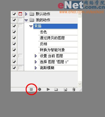 13、在动作面板选中素描动作,点红圈内的播放按钮执行动作。