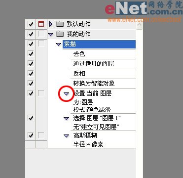 11、到这里就成功地录制了一个做素描效果的动作。点击每一个分动作前面的三角形按钮,可以看到操作的详细内容。