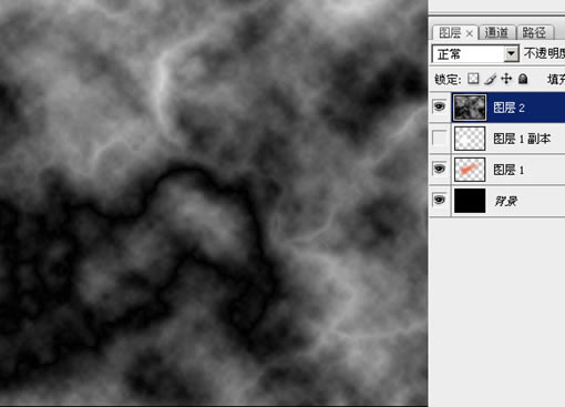 18、这时候你可以调整各层的明暗,以取得一个比较好的效果。 说实话效果要看刚开始那个云彩层的情况有一定随机性,不过你可以手工修饰各个图层获得较好的效果(包括使用涂抹、变亮、变暗等工具)