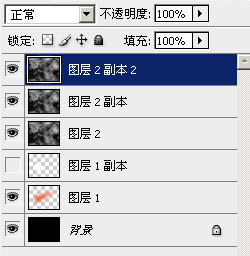9、在图层面板最下面这个云彩层 和图层1副本 之间 按住 alt 键 不放,点击鼠标左键。成为如下图样子: