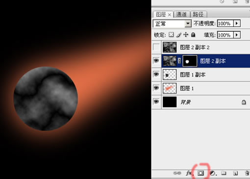 14、选中图层2副本的蒙板,然后用实心的黑色画笔,在圆形的边缘稍加涂画,把它修成不太规则的形状:
