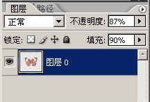 8、打开一副蝴蝶或其它你喜欢的昆虫图片,双击背景层将其变成图层0,用索套工具将蝴蝶选出,反选,Del删除背景,Ctrl D取消选区,把图层0的不透明度调到87%,填充调到90%