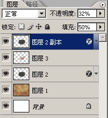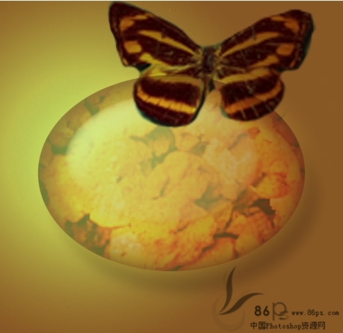 9、把蝴蝶拖到椭圆图层上,将椭圆层Ctrl J复制一层,放于蝴蝶层之上,设置不透明度32%和填充50%,调整安放位置