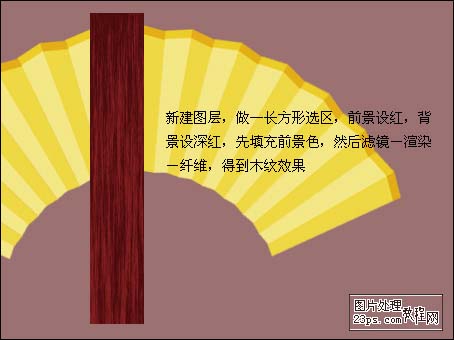 6、新建一个图层,用矩形选框工具绘制一个长方形选区,前景设置为红色,背景设置为深红色,先填充红色,不要取消选区,执行菜单:滤镜 > 渲染 > 纤维,得到木纹效果。