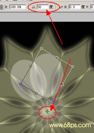 2.按Ctrl J把填充图层复制一份按Ctrl T变形,把中心点移到图片的下边的中点,角度的数值为30如图2,然后确认,然后按Ctrl Alt Shift T不停的复制,直到形成一个圆,然后把这些图层合并效果如图3。