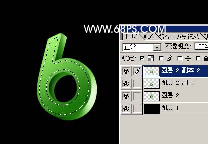 4.把文字图层复制一份,把副本填充为颜色:#328A1C,按Ctrl [ 把图层移下来,然后按住Alt键,移动小键盘上的方向图标左,下依次复制,复制后的大致效果如图5,然后把这些复制后的图层合并为一个图层。