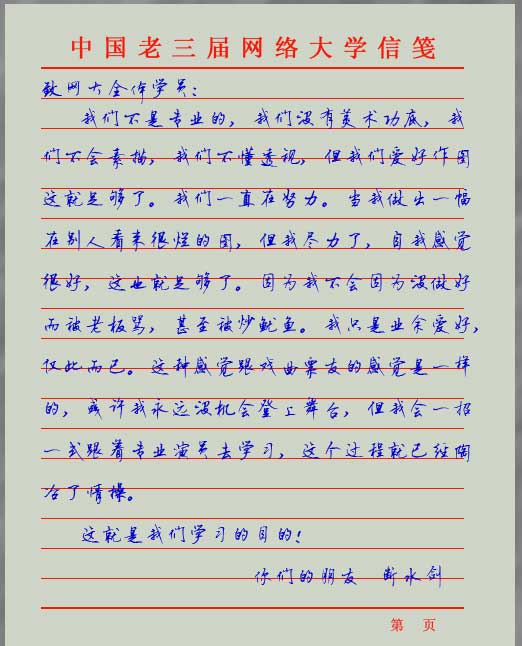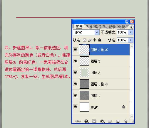 4.新建一个图层,做一个信纸选取填充你喜欢的颜色,再新建一个图层前景设置为红色,用一像素的铅笔工具在合适的位置画出第一条横格线,然后再按Ctrl J 复制一条