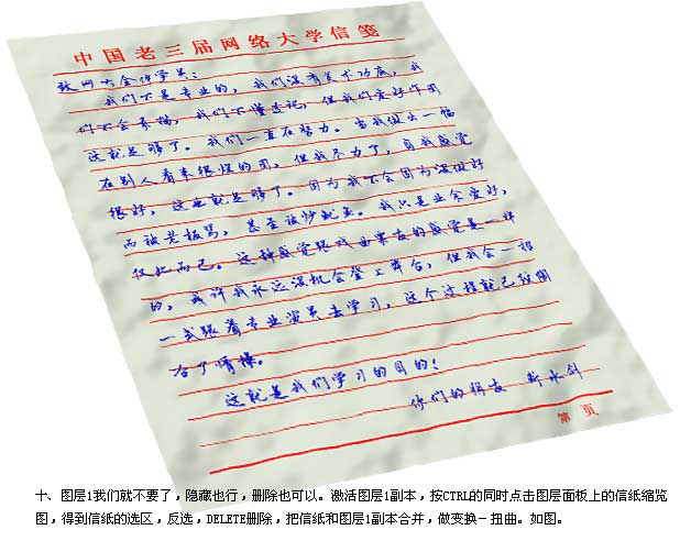 10.图层1去掉,回到图层1副本按Ctrl 的同时点击图层棉版上的信纸缩览图,得到信纸的选取,反选,Delete删除,把信纸和图层1副本合并,做变换 > 扭曲