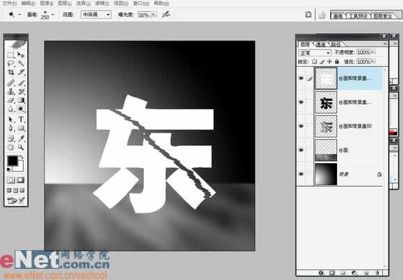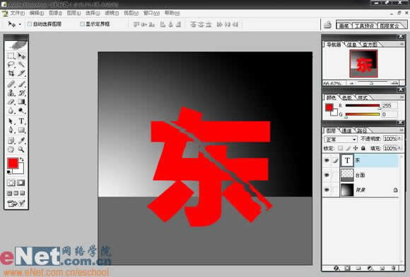 三、新建一个文字层,随意写一个字,我就用我的名字“东”吧!