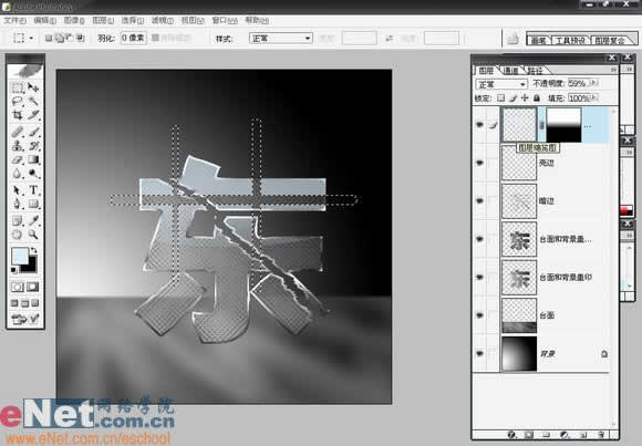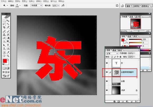 十一、载入“东”的选区,收缩一定量的像素后,清除两个盖印复制层中内容。