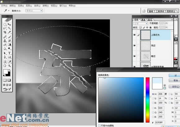 十六、用蓝色填充这个选区,并删除字外面的色块。并添加一个蒙板,在蒙板上使用黑白渐变。以做出反光渐无的效果。