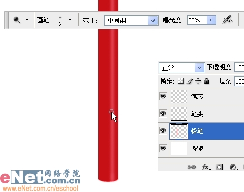 11、选择铅笔图层,选择减淡工具,设置如下,按住Shift键在铅笔杆表面上下涂抹几次形成一条高光。