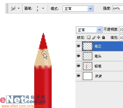 10、在图层面板按住Ctrl键单击笔芯层以载入其选区,然后给它填充和笔杆一样的暗红色。