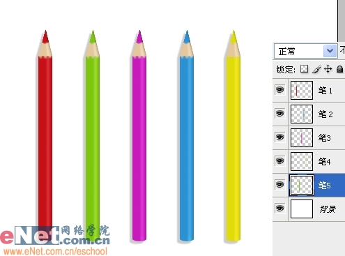 21、继续改变色相/饱和度的数值就可以调出各种不同颜色的铅笔,然后分别给它们添加同样的阴影效果。