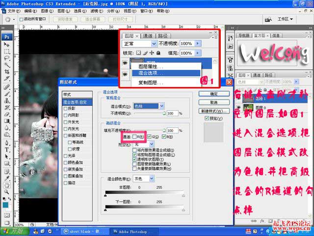 3、双击图层调出图层样式,在混合选项把图层混合模式改为“色相”,并把高级混合的R通道勾选。