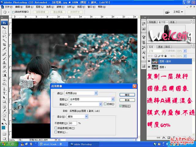 6、在执行菜单:图像 > 应用图像,参数设置如下图。