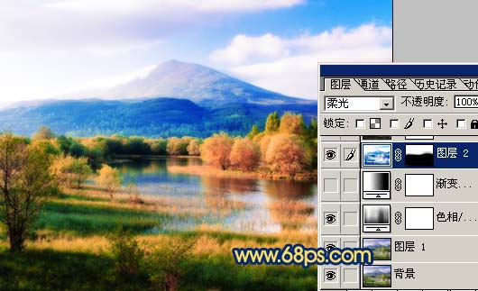 4、新建一个图层按Ctrl Alt Shift E盖印图层,把图层混合模式改为“柔光”,然后加上图层蒙版用黑色画笔把除天空和山脉以外的地方擦掉,再把渐变映射的图层隐藏。效果如图6。