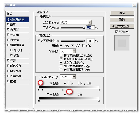 8.把图层1,图层模式改为柔光,需要更改一下图层样式的混合颜色带,键盘按着ALT键,鼠标拉动分离这个,设置如图