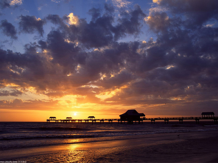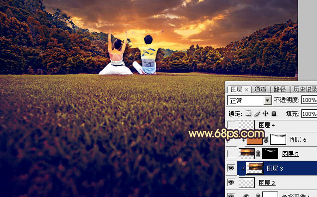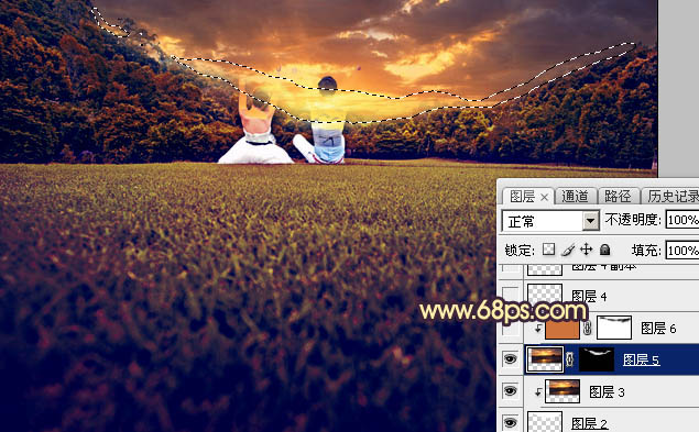 素材图片拍摄的是夏季场景,处理的时候分两大部分来完成。首先把图片主色转为秋季的黄褐色;然后更换素材天空部分,加入霞光素材,再渲染高光即可。