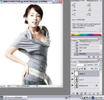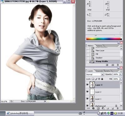 5.回到圖層,新建一個空白圖層,填充白色,這就是所謂的簡單美白,主要是為了做出人物膚色效果,
