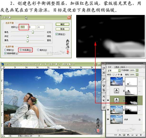 2、创建色彩平衡调整图层,加强红色区域,蒙版填充黑色,用灰色画笔在右下角涂抹。