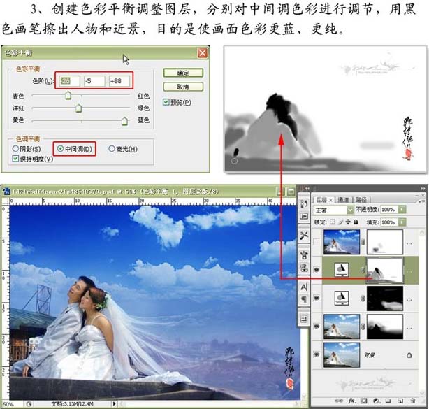 3、创建色彩平衡调整图层,分别对中间色彩进行调整,用黑色画笔擦出人物和近景,木的是使画面色彩更蓝、更纯。
