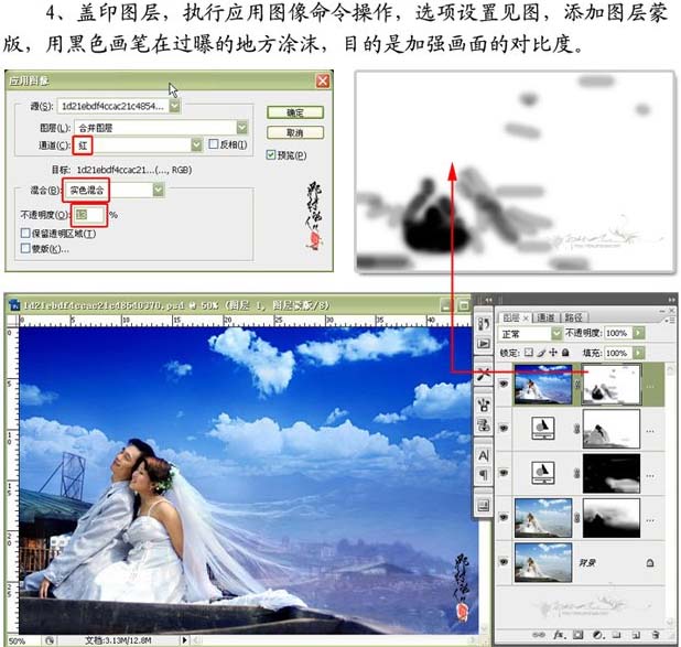 4、盖印图层,执行应用图象命令操作,选项设置如下图,添加图层蒙版,用黑色画笔在过暴的地方吐沫。