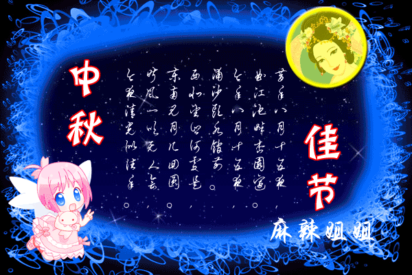 “昔年八月十五夜,曲江池畔杏园边。今年八月十五夜,湓浦沙头水馆前。西北望乡何处是,东南见月几回圆。 昨风一吹无人会,今夜清光似往年。”唔,很美的诗,对吧?还有几天就到中秋了,小编活动大使麻辣姐姐为大家制作了《中秋鉴》这个动画,提前祝大家节日快乐哦!