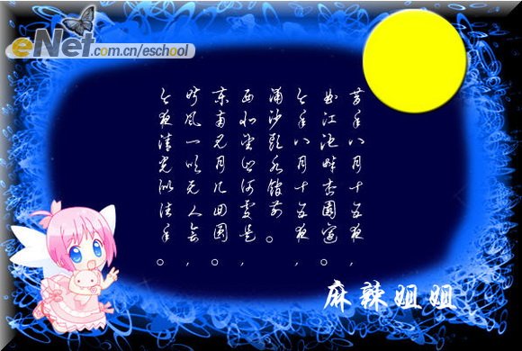 第六步:前景色设置为白色使用横排文字工具(快捷键T)输入古诗:昔年八月十五夜,曲江池畔杏园边。今年八月十五夜,湓浦沙头水馆前。西北望乡何处是,东南见月几回圆。 昨风一吹无人会,今夜清光似往年。 字体设置面板如[图9]所示(这里我用的是博洋行书体),所得图片效果如[图10]所示;