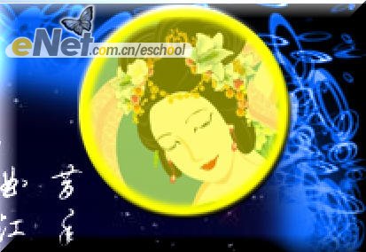 第十步:选择素材3上面的仙女头部,拖到月亮上,设置不透度为50%,调整大小稍小于月亮一点点儿,得到图片效果如[图15]所示;