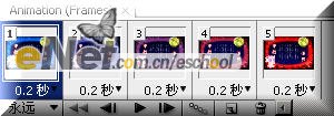 第十三步:新建一帧,背景颜色换成红色,其它不动,点击动画面板上动画过渡帧按钮,增加3帧,设置效果如[图18所示];得到5帧;设置选择帧延迟时间为0.2秒,得到效果如[图19]所示;