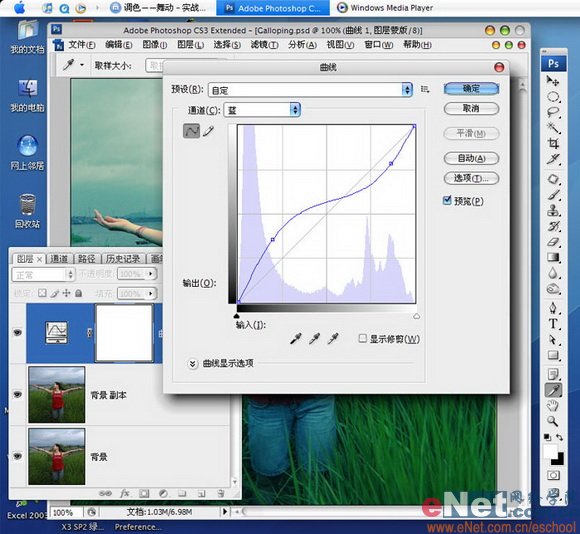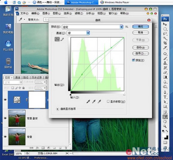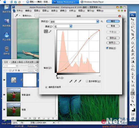 曲线调整层可能是最常用的调色方法之一,所以您如果很少用到,那么您可浪费了PS最好的命令之一。它既可以调明暗对比,也可以调各个通道的色彩,这次我用的就是适度地调整RGB三色通道得到强烈的色彩对比,具体的如下面三张截图,分别记录了RGB三色的调整设置。
