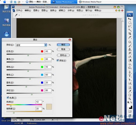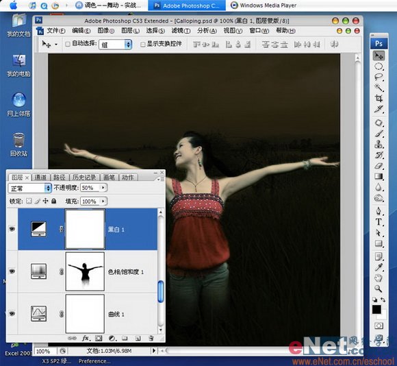 “黑白”调整层也是我常用的,您如果也喜欢那试试它吧,加上这么个调整层会让色彩饱和度降低而变灰,不过我觉得灰色才是世界上最美的色彩。添加好后,把调整层的不透明度调到50%