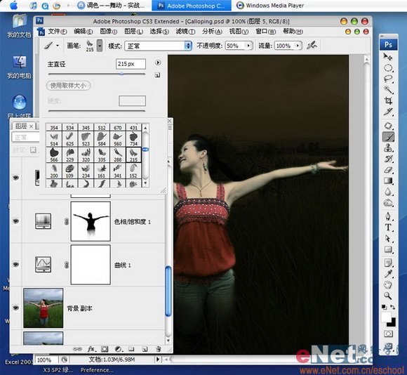 现在发现背景很亮,还是老方法,用“色相/饱和度”调整层的明度来降低调子,不过人物得用调整层的蒙版刷出来(调整层会自动添加一个蒙版,使用黑色画笔将不需要的地方进行涂抹即可),大家可以在截图中看到蒙版中涂抹的情况
