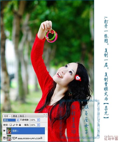 1、打开原图,复制一层,模式设为:柔光。