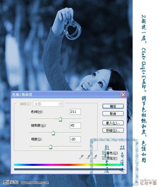 2、新建一个图层,按Ctrl Shift Alt E盖印图层,把前景设为蓝色,Ctrl U调整色相/饱和度,勾上右下角的“着色”,如下: