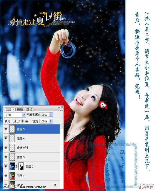 7、拖入美工字,调节大小和位置,新建一层,用星星笔刷点几下,最后,描边与否,看个人喜好。